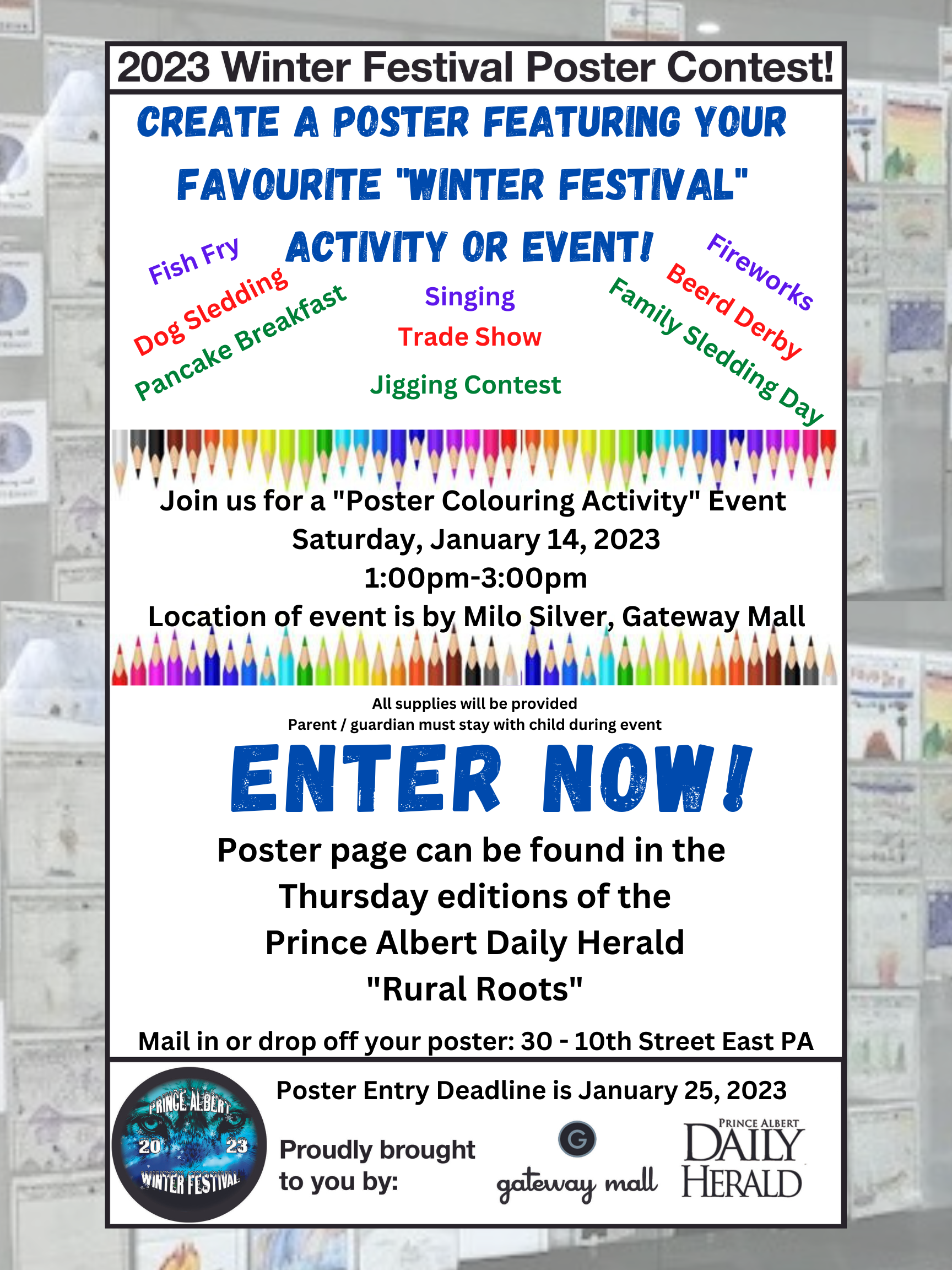 Winter Festival Poster Colouring Saturday, January 14, 2023 1:00 PM 3:00 PM 13:00 15:00 Google Calendar ICS Join us here at the Gateway Mall for a fun afternoon of colouring / drawing and creating a poster about the Winter Festival. All posters will be submitted for the contest. Open to children / youth 4-14 years of age.All supplies will be provided.